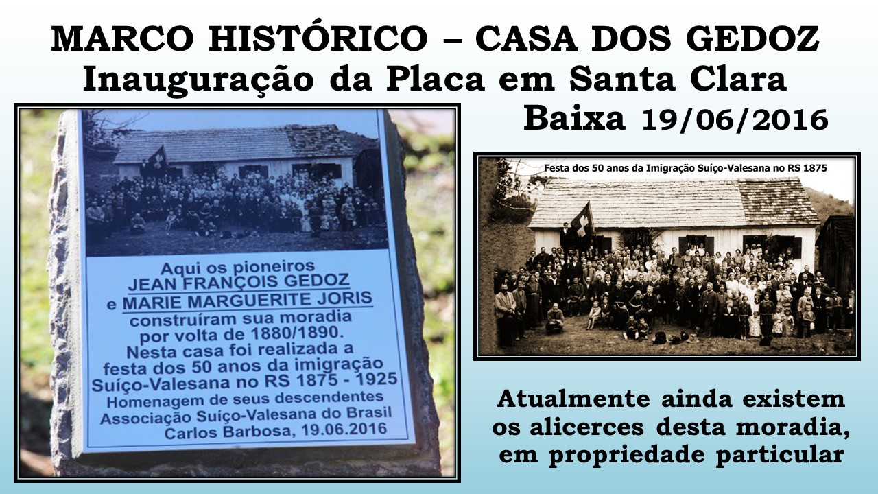 Vizando salvaguardar e documentar a cultura suíça no RS, a ASVB e a Família Gedoz, inauguraram uma placa em homenagem aos imigrantes suíço-valesanos, Jean François Gedoz e Marie Marguerite Joris Gedoz, juntamente com seus 7 filhos, fixaram residência, em Santa Clara Baixa, Carlos Barbosa. Esta família foi uma das três famílias pioneiras que aqui chegaram em 1874, e nunca mais sairam. Atualmente, ainda existem os alicerces desta moradia, que, provavelmente, foi sua segunda moradia, a qual foi construida por volta de 1880, pois quando chegaram encontraram apenas mata virgem. Nesta casa, em 1º de agosto de 1925, foram comemorados os 50 anos da Imigração Suíço-valesana no RS com a participação de toda a comunidde.