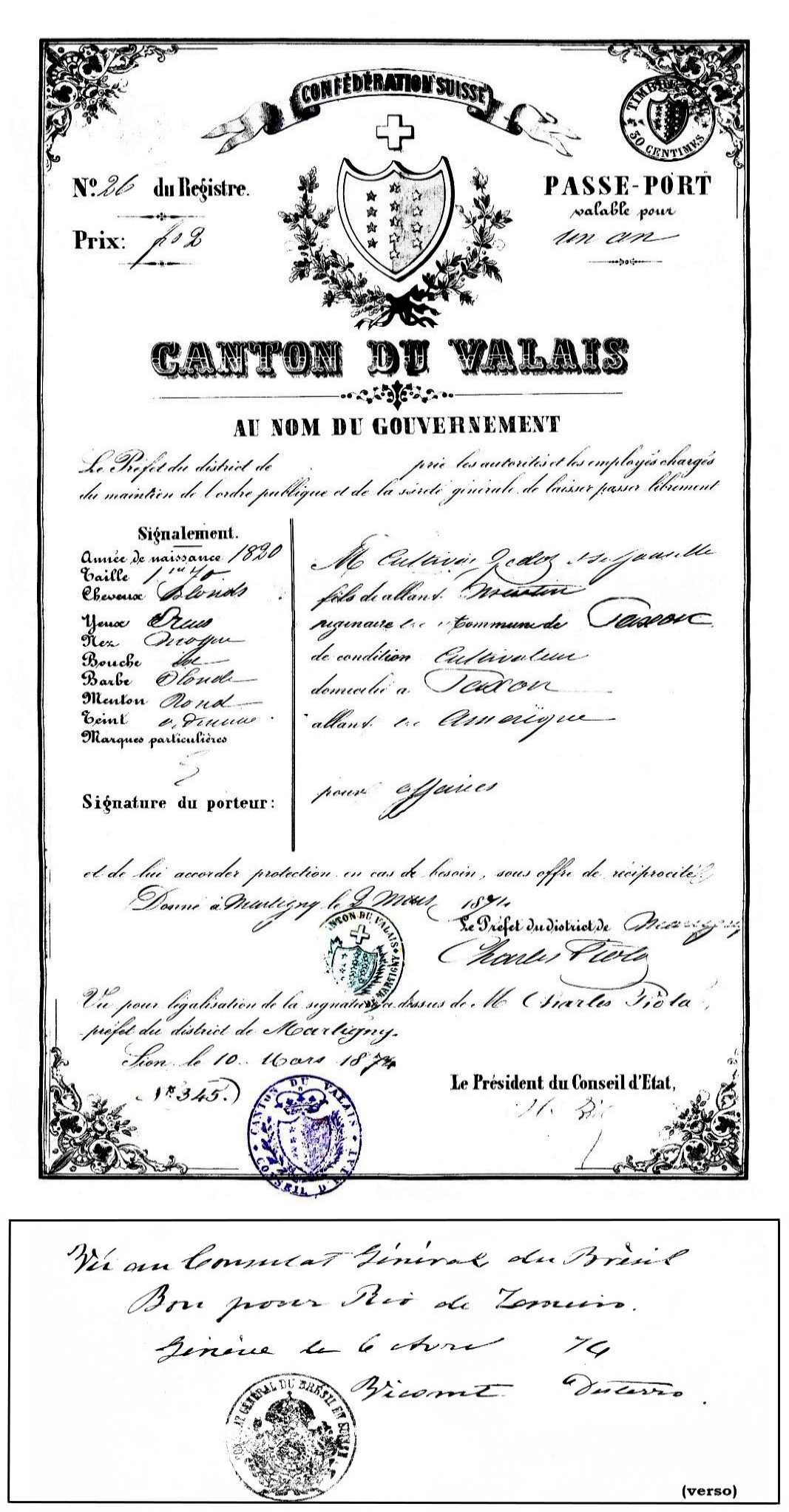 Documento do Vallais, Suíça Destinado a Joseph Antoine Sauthier - 1875. Original escrito em francês.