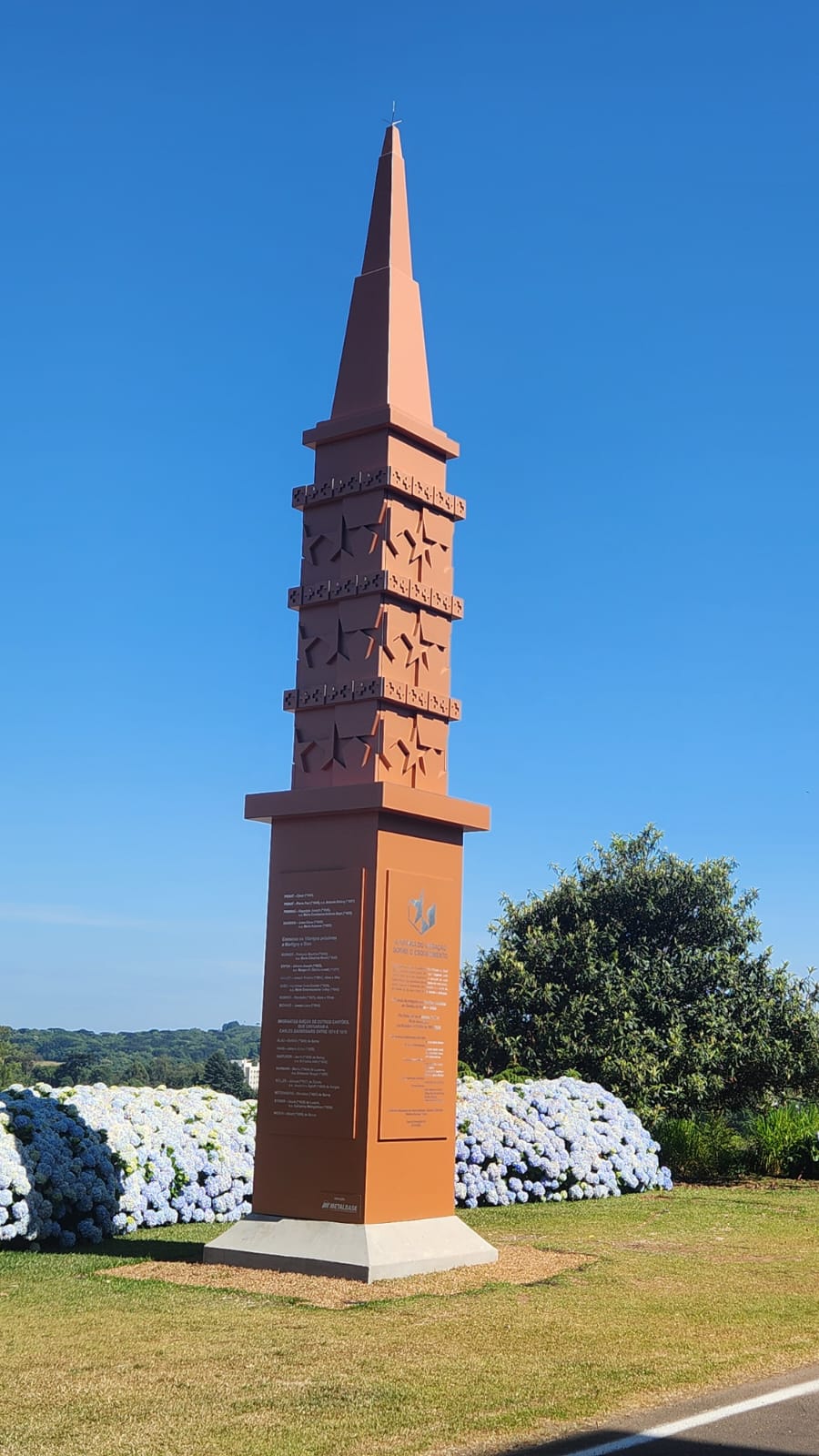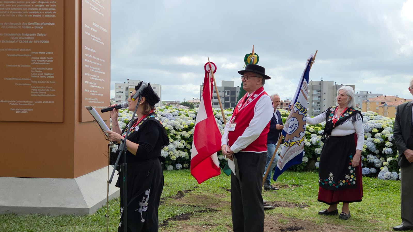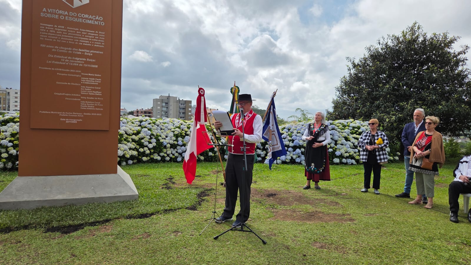 Com as bênçãos da maior autoridade suíça entre descendentes de valesanos do RS e os suíços da atualidade, o querido Pe. Agostinho Sauthier, foi entregue para a cidade de Carlos Barbosa, no sábado 22 de novembro de 2025, um Obelisco de aço de 4 toneladas e 12,5m de altura.